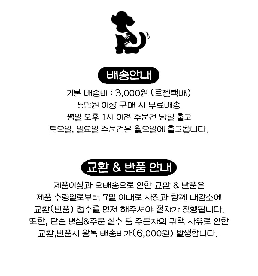 배송 비용 ㅣ 단순 변심은 왕복 택배비 6,000원 (반품 상품을 제외한 나머지 금액이 50,000원 이상일 경우에는 3,000원)
